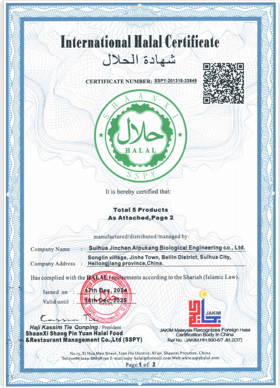 綏化金晨愛(ài)普康生物工程有限公司已成功通過(guò)出口企業(yè)的HALAL認(rèn)證